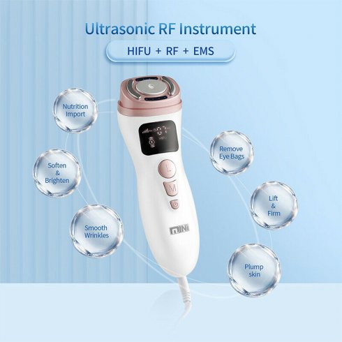 Mini HIFU - 3 in 1 verjongingsapparaat voor de huid van het gezicht met ultrageluid, radiofrequenties en elektrische spierstimulatie. HIFU-echografie richt zich op de regeneratie van collageen in de huid, waardoor een facelift ontstaat. Radiofrequenties zenden een miljoen microgolven per seconde uit, waardoor de huid diep wordt verwarmd en de poriën worden geopend voor een betere reiniging van de huid. EMS - elektrische stimulatie van spieren verzacht, verstevigt en masseert de huid. Het verzacht rimpels, verwijdert je met een cam onder de ogen en maakt de huid recht . U kunt dit universele apparaat op uw gezicht, ogen en hals gebruiken.